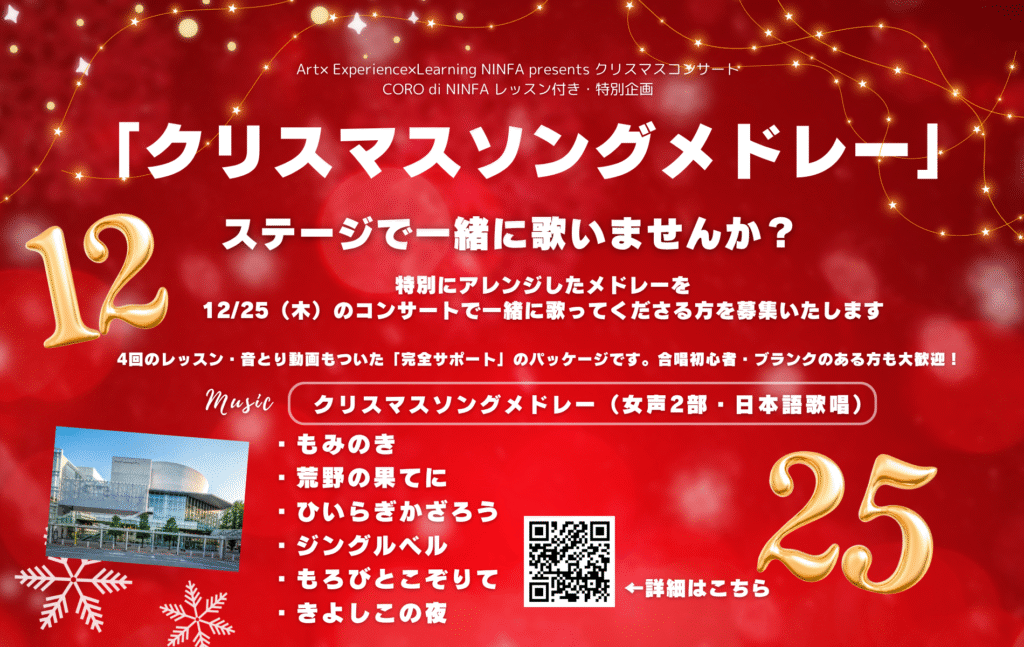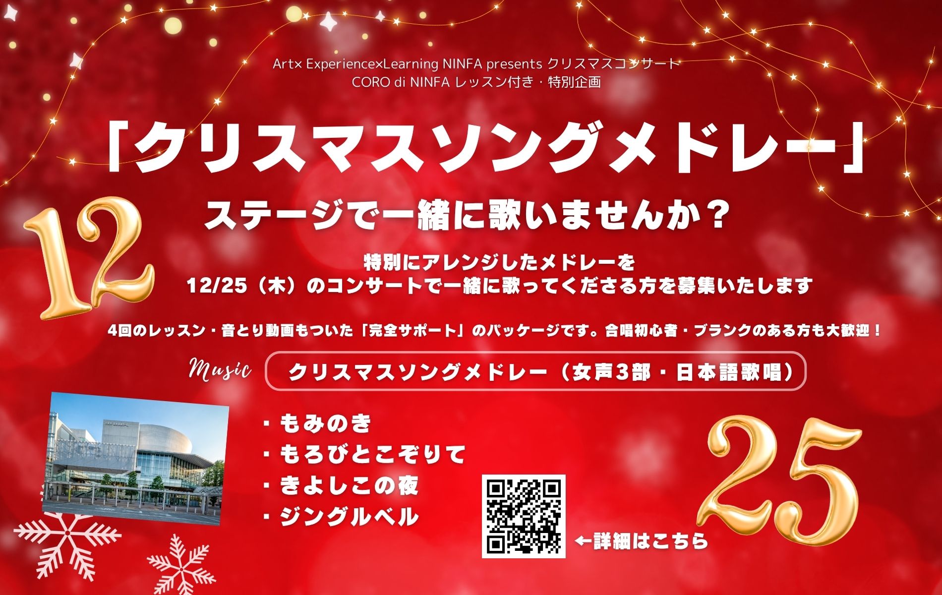 NINFA主催のクリスマスコンサート(12/25 小金井 宮地楽器ホール 小ホールにて)で 合唱曲「CORO di NINFA クリスマスメドレー」を歌う 有志合唱メンバーを募集いたします…